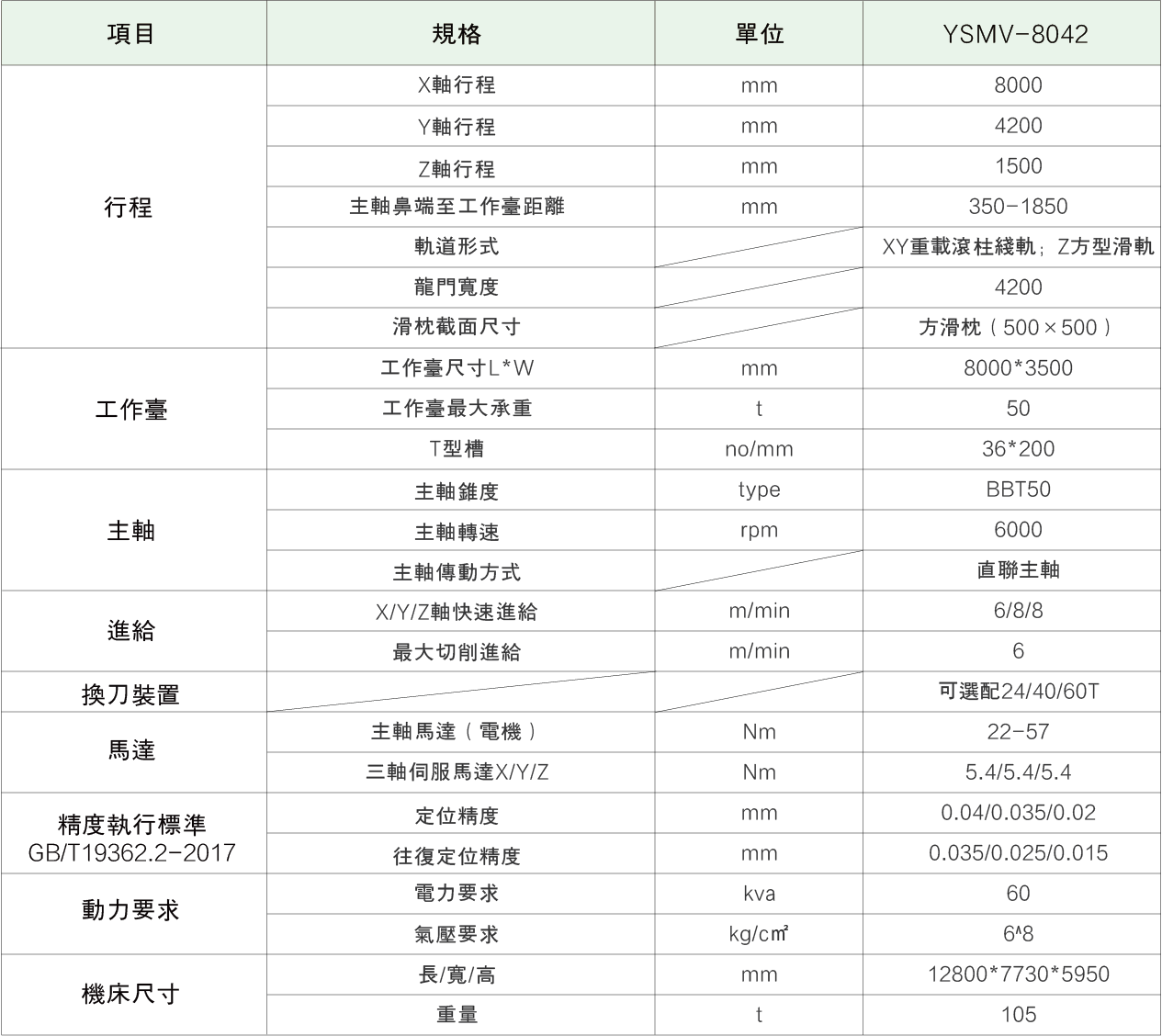 主軸采用22-57KW大扭矩交流伺服電機驅動,主軸變速采用自動兩段高低檔變速箱。變速箱潤滑油溫采用獨立油冷裝置控製;主軸帶有自動拉刀裝置,液壓松開、碟簧拉緊,松、拉刀檢測,安全可靠;主軸采用BBT50高剛性主軸,超強切削力;